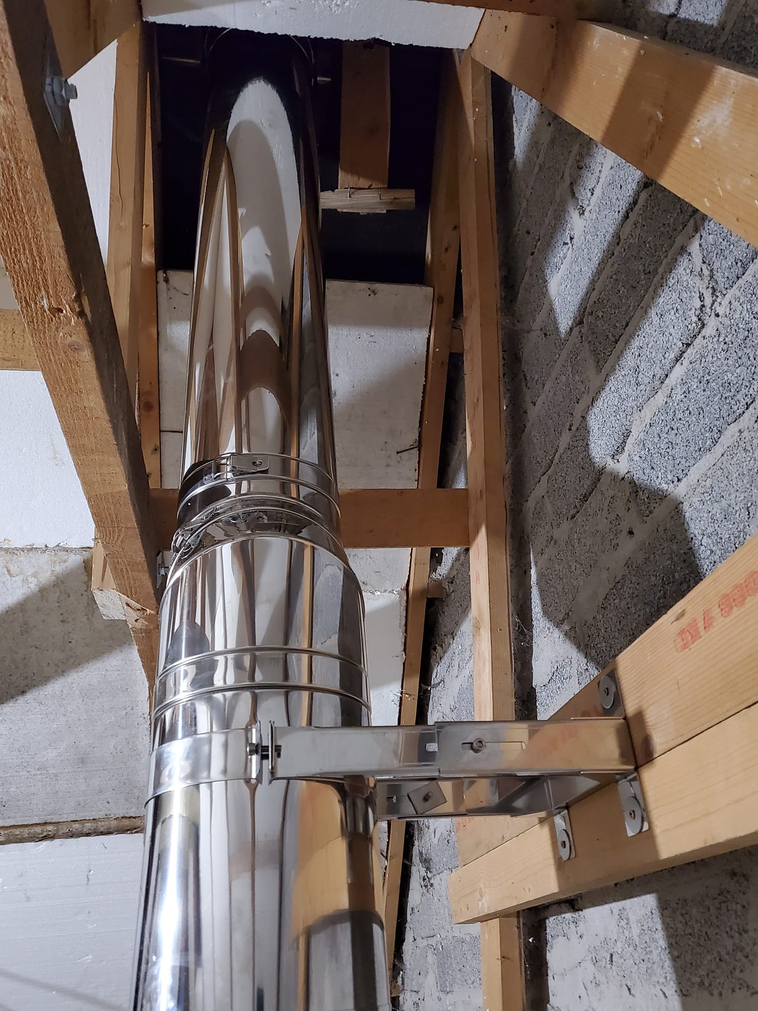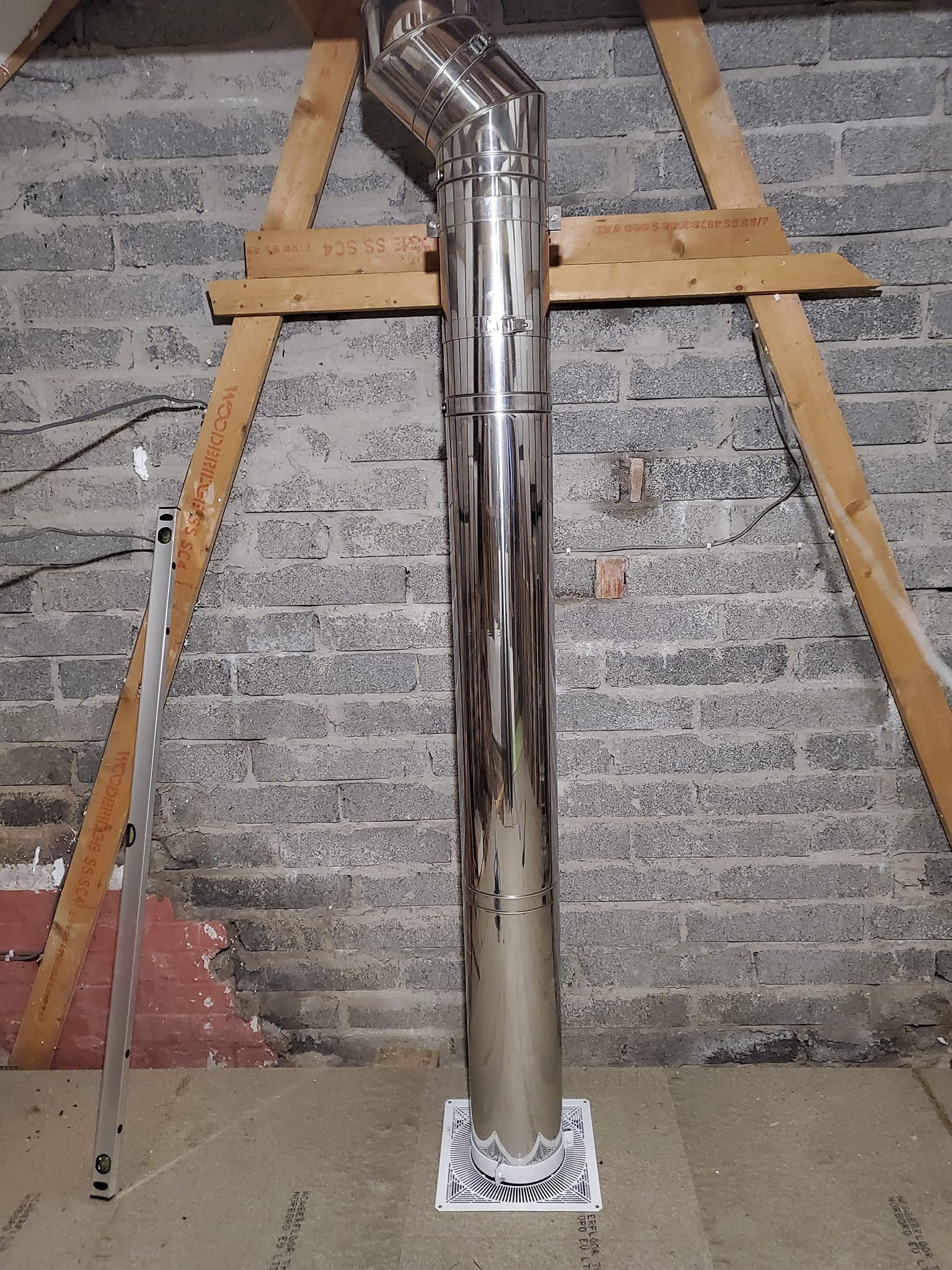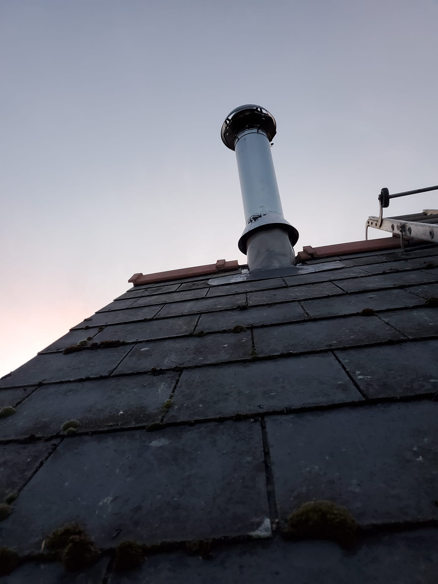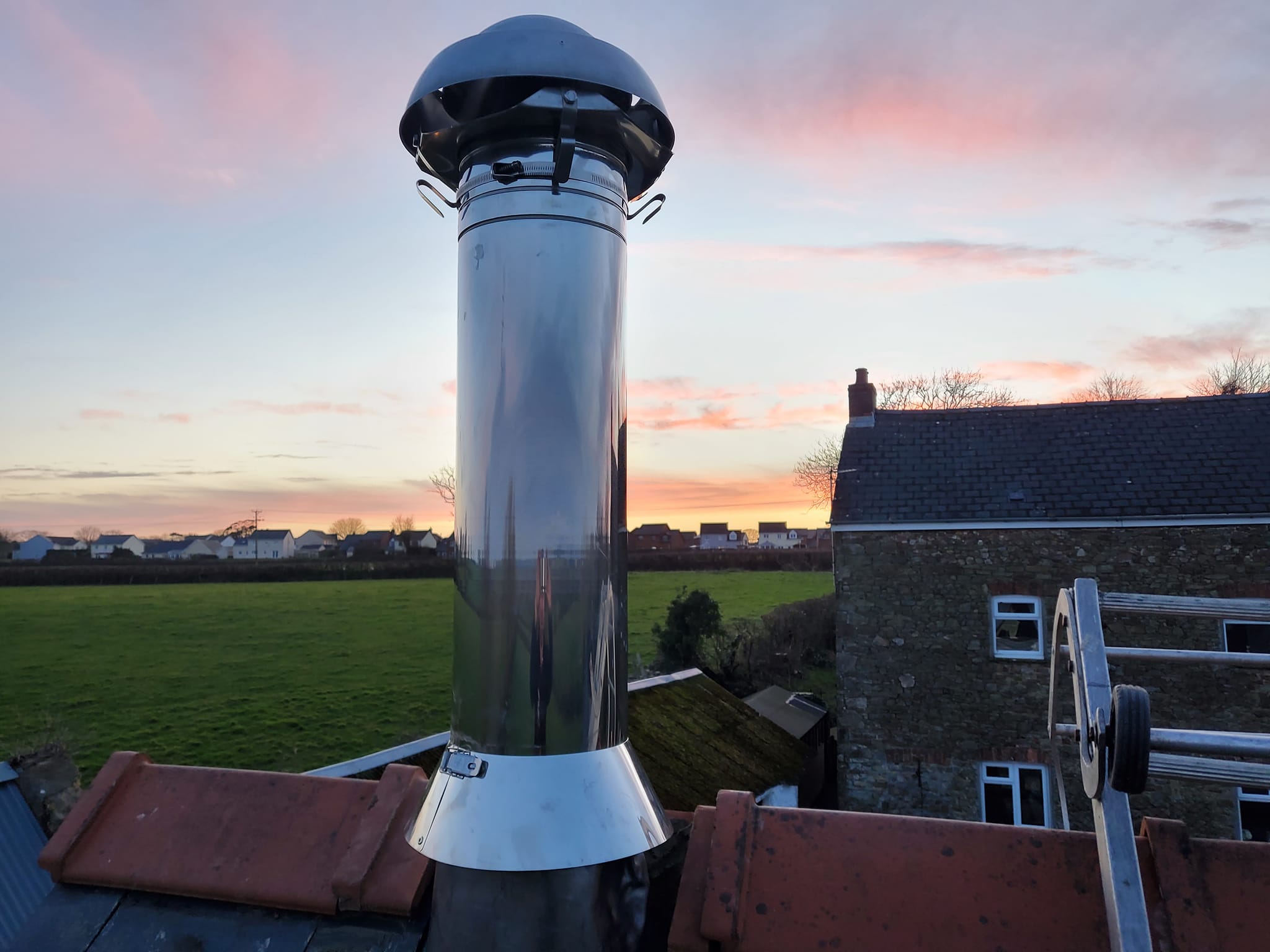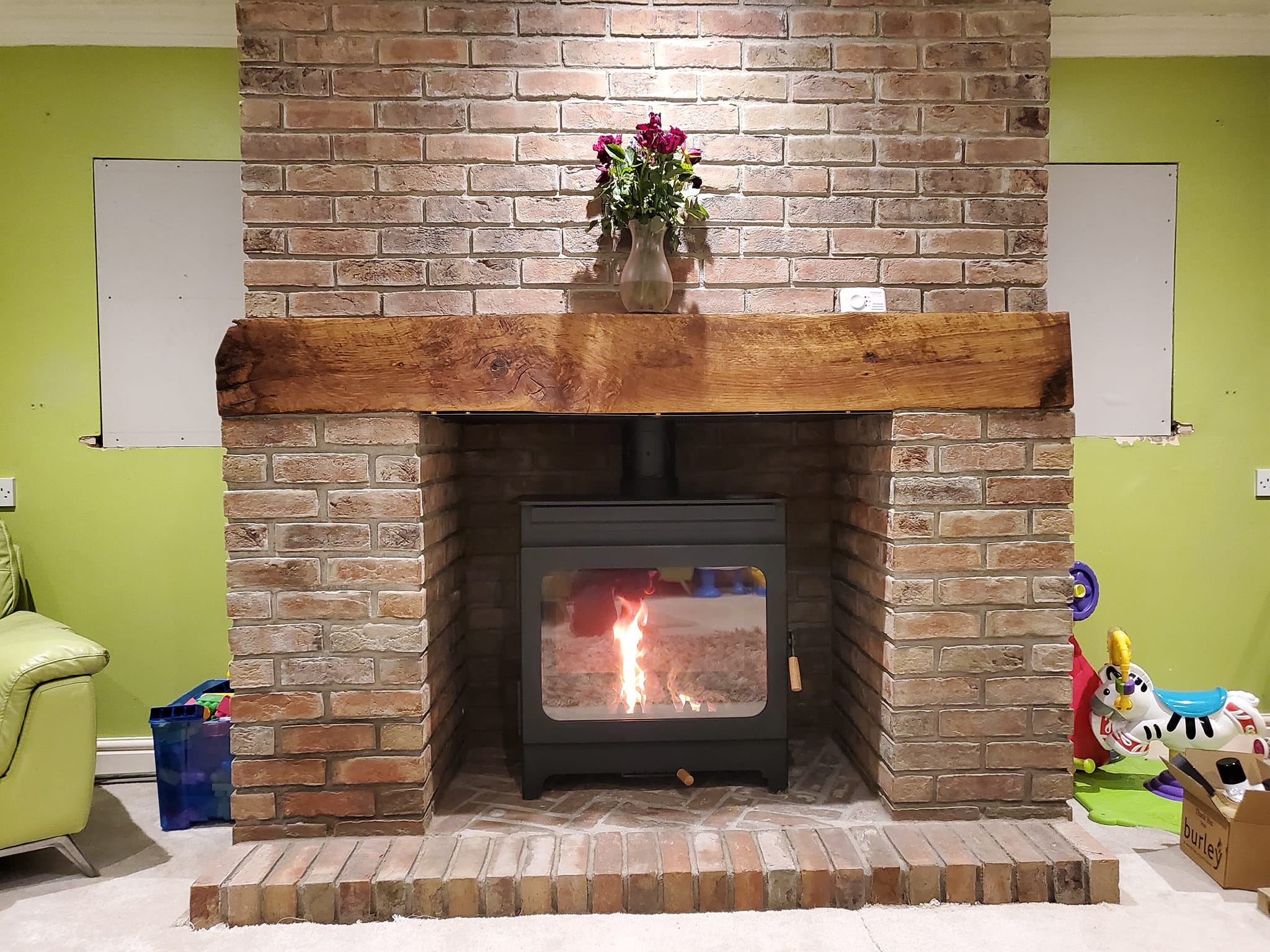 The mahoosive Burley Wakerley housed in a fire place specifically built for the appliance. The heat exchangers built into Burley stoves allows for a real wooden mantle by employing heat shielding with an air gap to hit regs. All installed just in time for a Pembrokeshire sun set photo.