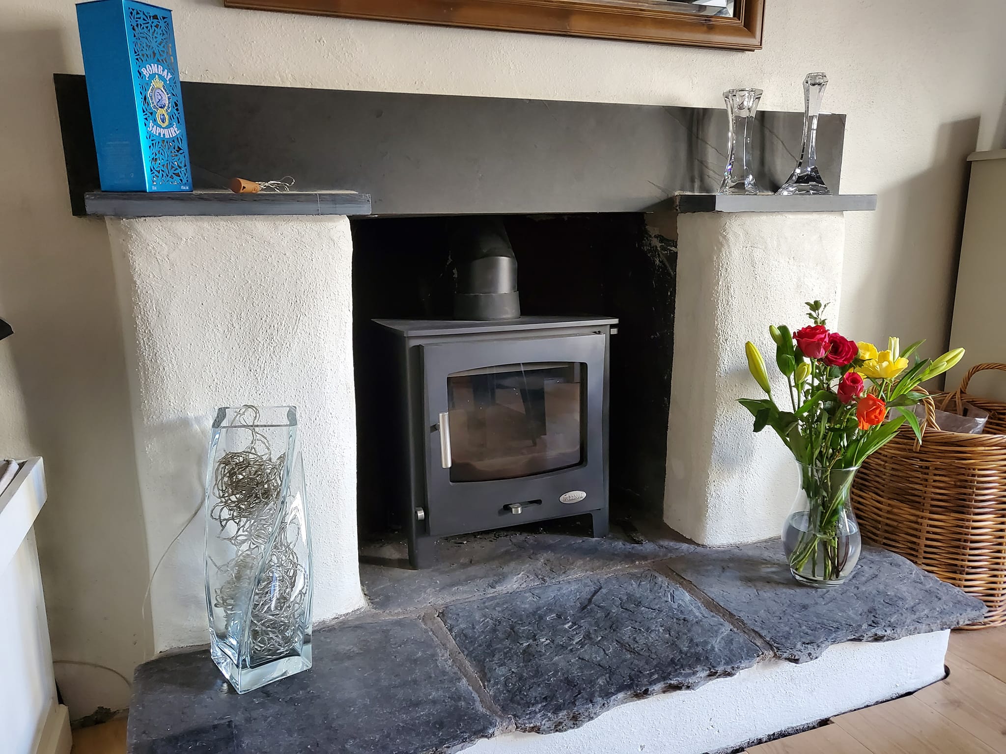 One house two woolly mammoths stoves and two fire place rebuilds. Slate replacing the wooden lintels that were scorched to hell!!! Thankfully we managed to avoid major structural works to get these in…apart from a new 6″ x 6″ x 1200 concrete lintel to replace the old wooden one.